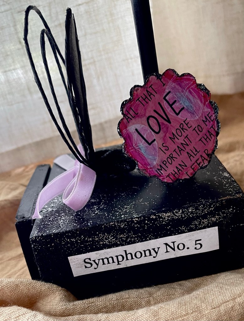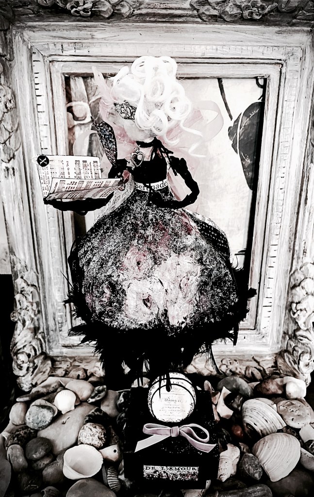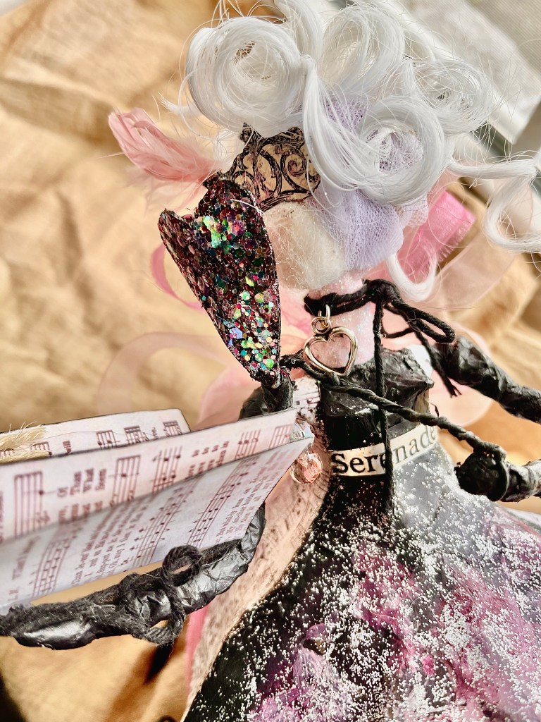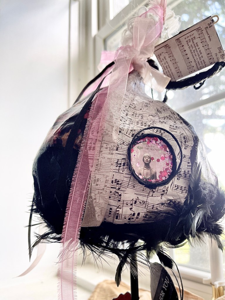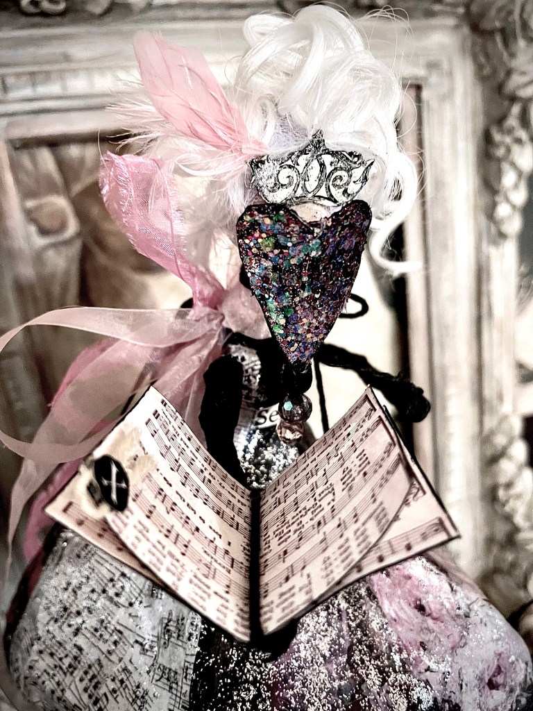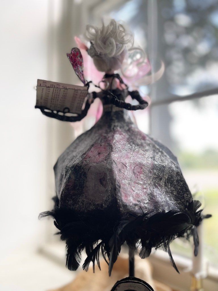 She is adorned with ribbons, feathers, glitter, paint, and decoupage in the front and back of her dress.